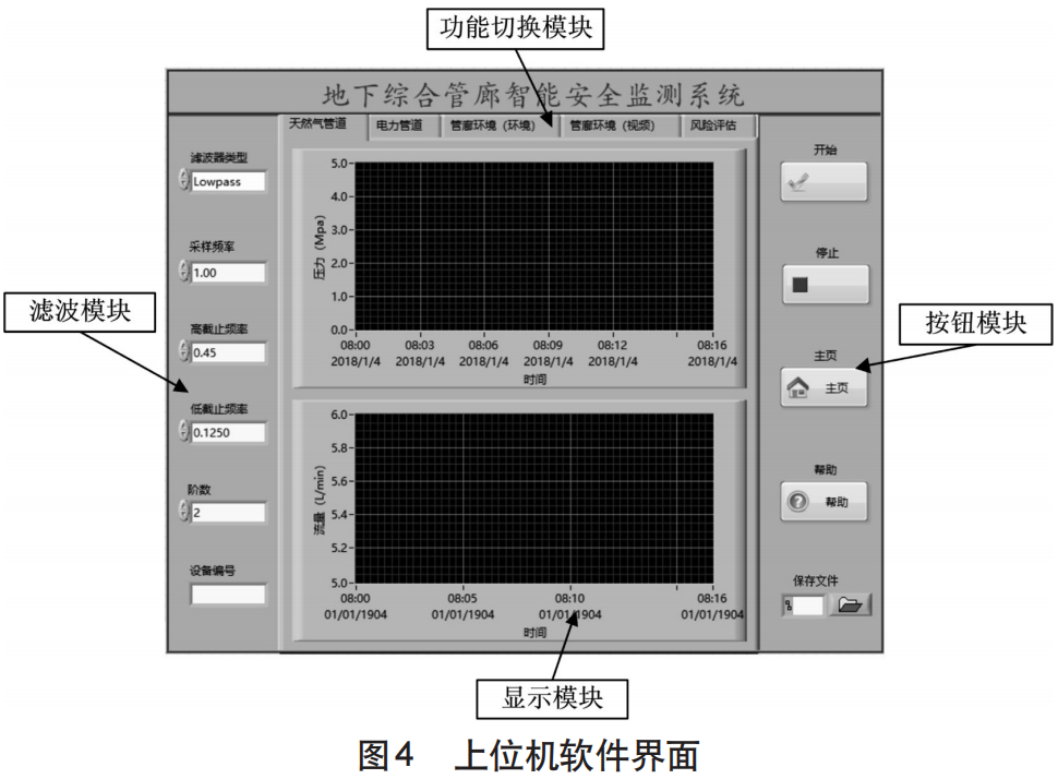 对于数据处理终端,通过其微处理器(MCU,采用STM32单片机搭建)将数据采集端发送的数据接收,接收到的数据实时传输到上位机软件进行进一步的处理。其中,压力及流量数据可对天然气管道的异常情况进行实时显示及风险评估,同时还可利用声波数据的相关分析对天然气管道的泄漏位置进行初步计算;电压及电流数据可对电力管道的异常情况进行实时显示及风险评估;人员入侵数据(包括摄像头的视频数据及红外传感器的红外数据)可通过视频的方式在软件界面实时显示。通过综合分析地下综合管廊的天然气管道异常检测情况,电力管道异常检测情况,并结合温度及甲烷浓度数据,可对地下综合管廊的安全性能进行风险评估,具体介绍如下。