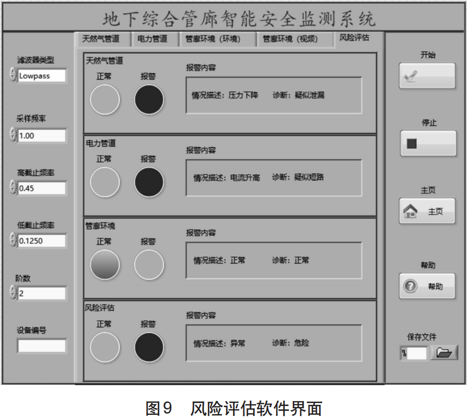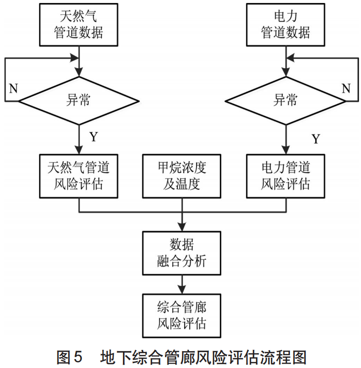 如图5所示为地下综合管廊风险评估流程图,其基本原理为:对天然气管道数据进行异常诊断,若数据异常则给出天然气管道的风险评估及数据异常的可能原因;对电力管道数据进行异常诊断,若数据异常则给出电力管道的风险评估及数据异常的可能原因;当天然气管道及电力管道同时存在数据异常时,则地下综合管廊存在安全隐患,此时将在数据融合分析及判断的基础上对地下综合管廊的安全性能进行评估,并给出可能出现的危险情况。