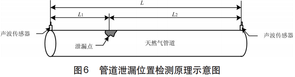 如图6所示为管道泄漏位置检测原理示意图,假设管道总长度为 L,泄漏点距离管道两侧的长度分别为 L1及L2,在管道两侧分别安装声波传感器,当管道发生泄漏时,泄漏点发生的声音将由该点沿管道向两侧传播,则,存在如下关系式: