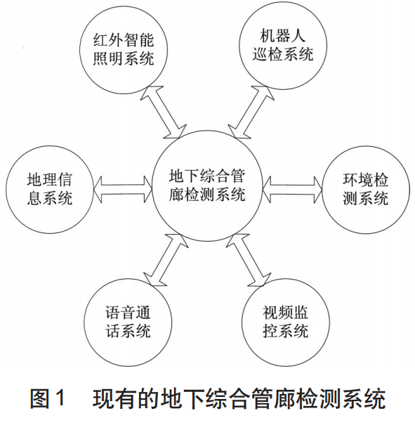 对于地下综合管廊的监测技术而言,现阶段主要包括红外智能照明系统、机器人巡检系统、环境检测系统、视频监控系统、语音通话系统及地理信息系统等(如图1所示),上述常见的监测系统对管廊内的某个具体领域进行了实时监测,一定程度上提高了地下综合管廊的安全性,但由于地下综合管廊内的市政管线种类众多,不同类型的市政管线故障极易引起交叉安全影响,尤其是天然气管道泄漏时,电力管线的短路电弧极易引起天然气爆炸,从而造成无法挽回的损失,而现有的监测技术均无法满足地下综合管廊交叉安全监测及风险评估的要求,基于此,本文设计了一种基于数据融合分析的地下综合管廊安全监测系统,该系统可实时采集地下综合管廊内天然气管道、电力管道及管廊环境的相关工况数据,并对采集到的数据进行融合分析及判断,在此基础上进一步对地下综合管廊的安全风险作出评估,从而实现对地下综合管廊的智能化安全监控。