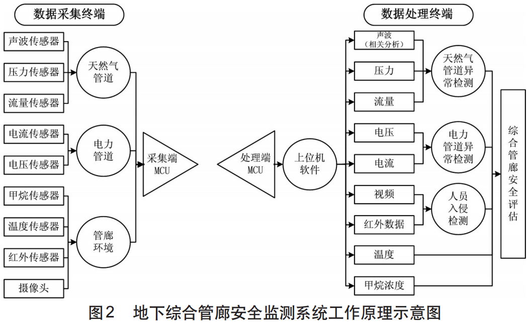 如图2所示为地下综合管廊安全监测系统工作原理示意图(以下简称安全监测系统),安全监测系统由数据采集终端及数据处理终端组成,其中数据采集终端实时采集地下综合管廊内的电力管道及天然气管道的相关工况数据,同时还采集地下综合管廊内环境的相关数据及人员入侵信息,采集到的数据经电缆实时传输到数据处理终端,数据处理终端在对数据进行融合分析及判断的基础上,对地下综合管廊的安全风险作出评估,从而为地下综合管廊的维护人员提供一定的数据支撑。