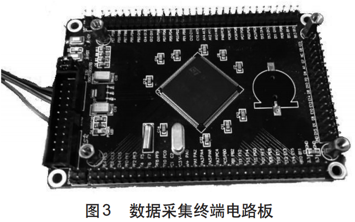 对于数据采集终端,所采集的数据包括天然气管道数据、电力管道数据及管廊环境数据。其中天然气管道的采集数据包括天然气的压力、流量及声波数据;电力管道的采集数据包括输电线路的电流及电压;管廊环境的采集数据包括地下综合管廊内的甲烷浓度、温度及人员入侵(采用红外传感器及摄像头实现)数据。采集到的数据实时传入数据采集终端的微处理器(MCU,采用STM32单片机搭建),微处理器将采集到的数据进行标定处理后,经电缆线实时传输到数据处理终端。其中声波传感器、压力传感器、电流传感器、电压传感器、甲烷浓度传感器及红外传感器均为0-5V电压信号输入,而所使用的微处理器为数字芯片,因此需进行数模转换,此处采用 16 位的 AD7705 芯片进行数模转换[6],而流量传感器及温度传感器的输出数据为数字量,可直接接微处理器进行处理。根据电路设计,加工完成的数据采集端电路板如图3所示。