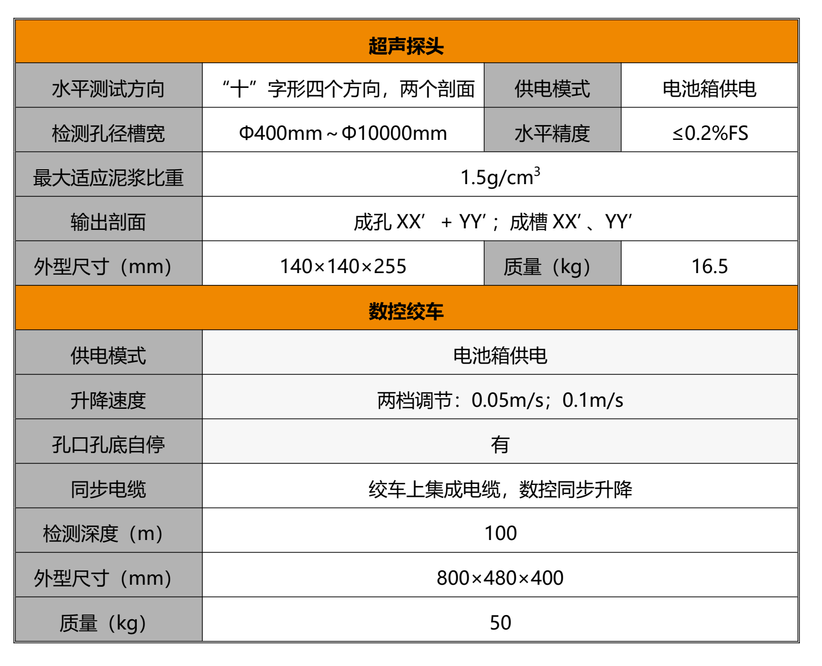 12.超声探头盲区小,功率大,适应能力强。探头对应的孔径检测范围400mm~10000mm。最大泥浆比重可达1.5g/cm3,适合几乎所有工程成孔成槽的检测。
