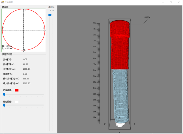 15.分析软件采集波形自动判读,自动识别井壁,输出结果有影像图、波列图、X-X’和Y-Y’偏离曲线图、孔径曲线图,全孔各深度测点测距、孔径、垂直度数表等,并可查看3D图,准确直观呈现孔内状态特征,易于分析。