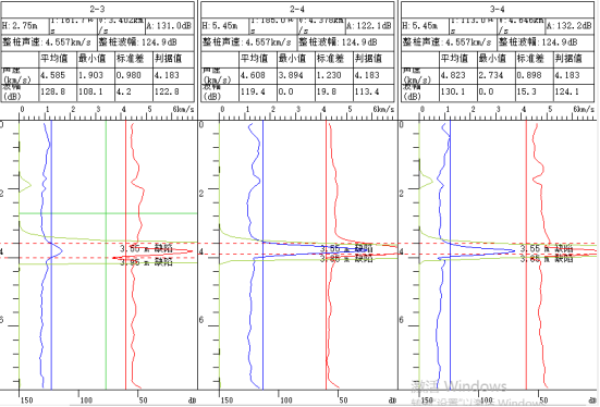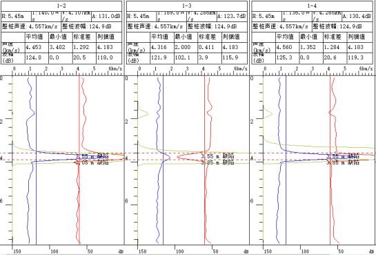 陕西交院模型桩,1号桩,桩长8m,桩径800mm,埋设4根声测管,管距分别为:1-2剖面575mm;1-3剖面810mm;1-4剖面580mm;2-3剖面550mm;2-4剖面810mm;3-4剖面525;该桩3.55m到3.85处有严重的缺陷,完整性类别为IV类。在1.65m附近存在波幅略低,声速基本正常的情况,该位置存在因施工工艺原因导致的混凝土离析现象。