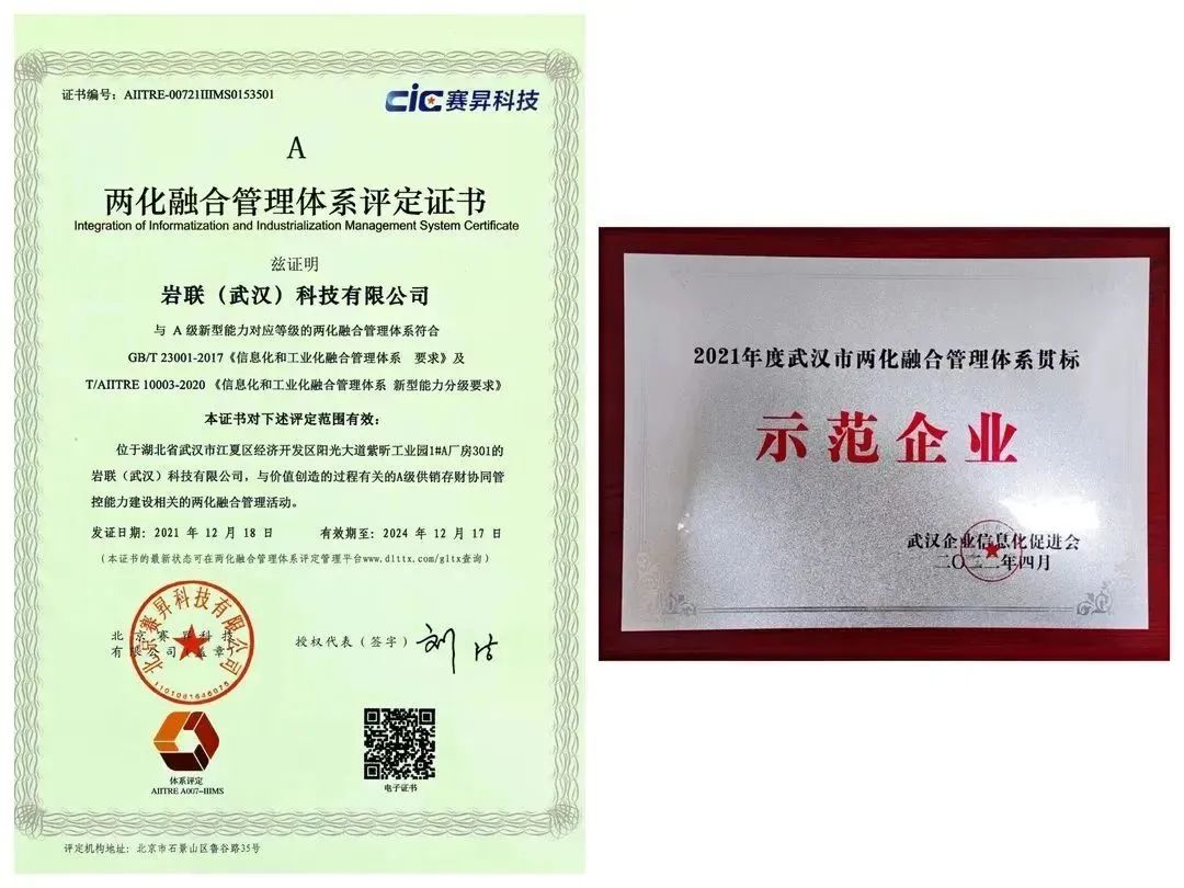 2022年4月8日,岩联技术获评武汉市“两化融合”管理体系贯标示范企业,标志岩联的信息化与工业化、数字化深度融合获得权威认可。