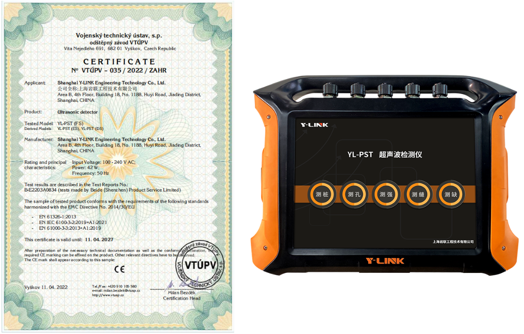 2022年4月11日,在建设国际标准质量体系过程中,YL-PST超声波检测仪产品系列率先成功通过欧盟CE认证资质,获得欧洲市场通行护照。