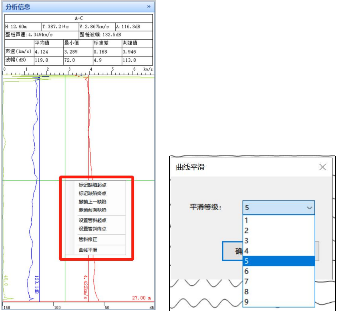 解决方法:分析软件右侧曲线图右键,调整曲线平滑等级,等级越高平滑程度越大。